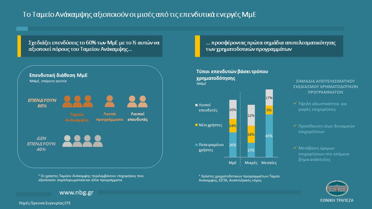 Σε ένα σύνθετο περιβάλλον (i) ενισχυμένης επενδυτικής διάθεσης (με το 60% των ΜμΕ να σχεδιάζει επενδύσεις έναντι 40% την προηγούμενη τριετία) και (ii) εντεινόμενης συσταλτικής νομισματικής πολιτικής, ο ρόλος του Ταμείου Ανάκαμψης διαφαίνεται σημαντικός. Όντως, το ½ των ΜμΕ με ενεργά επενδυτικά σχέδια (27% του συνολικού τομέα) στοχεύει ή ήδη αξιοποιεί σχετικούς πόρους, δημιουργώντας ισορροπημένες χρηματοδοτικές δομές ιδίων κεφαλαίων, δανείων και επιδοτήσεων. Σε αυτό το πλαίσιο, το επενδυτικό ενδιαφέρον ξεκινά να αποκτά πρακτική διάσταση, με το ποσοστό των ΜμΕ που έχουν κάνει αίτηση στο Ταμείο Ανάκαμψης να προσεγγίζει το 11% το πρώτο εξάμηνο του 2023 (14% στις μεσαίες), ενώ ο σταδιακός περιορισμός της πληθωριστικής πίεσης στις πρώτες ύλες αναμένεται να ενεργοποιήσει ακόμα μεγαλύτερο κομμάτι των επενδυτών μέσα στους επόμενους μήνες. Ακόμα πιο σημαντική είναι η διαπίστωση ότι, παρά τη σχετικά υψηλή πολυπλοκότητα των διαδικασιών του Ταμείου, δε φαίνεται να παρατηρείται υστέρηση στην πρόοδο υλοποίησης επενδύσεων. Συγκεκριμένα, το 6% των ΜμΕ που επιθυμούν να επενδύσουν μέσω Ταμείου Ανάκαμψης είναι ήδη σε στάδιο υλοποίησης ενώ ένα επιπλέον 7% έχει προχωρημένα σχέδια (με τα αντίστοιχα ποσοστά για τους «επενδυτές» εκτός Ταμείου να βρίσκονται σε παρόμοια επίπεδα, της τάξης του 8%). Στο σημείο αυτό αξίζει να σημειωθεί ότι η στήριξη του Ταμείου κατευθύνεται προς όλες τις κατηγορίες επενδύσεων (από πράσινες και ψηφιακές μέχρι καινοτομίας και συνεργασιών), καλύπτοντας περί το ½ καθεμιάς, αναδεικνύοντας τον ισορροπημένο σχεδιασμό του.