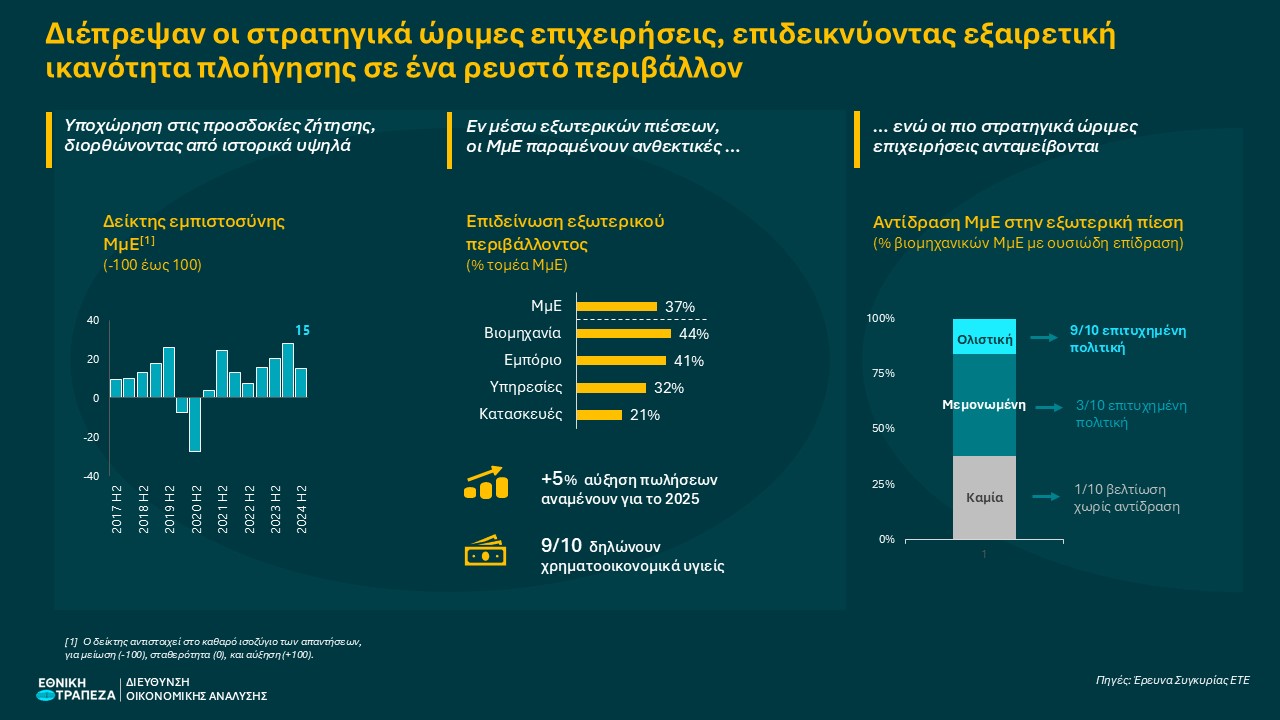 Οι πρώτες ενδείξεις από την τρέχουσα έρευνά μας είναι θετικές, υποδηλώνοντας ότι οι διαδοχικές κρίσεις των τελευταίων ετών έχουν «ωριμάσει» και ενδυναμώσει τις ελληνικές επιχειρήσεις. Όσον αφορά τα επενδυτικά σχέδια, σταθερή εμφανίζεται η διάθεση στους περισσότερους κλάδους. Ακόμα και οι έντονα πιεζόμενοι τομείς της βιομηχανίας και του χονδρικού εμπορίου, ενώ φαίνεται σε ένα βαθμό να περιορίζουν την υψηλή επενδυτική δυναμική τους, η πλειοψηφία των επιχειρήσεων εξακολουθεί να στοχεύει σε ανάπτυξη (61% και 56% του τομέα, αντίστοιχα), παραπέμποντας περισσότερο σε στάση αναμονής, παρά σε επενδυτική κόπωση. Ακόμα πιο θετική είναι η εικόνα σε όρους ανθεκτικότητας και χρηματοοικονομικής υγείας, με το ποσοστό των ΜμΕ που αντιμετωπίζει σοβαρά προβλήματα ρευστότητας να παραμένει κοντά στο ιστορικό χαμηλό του (12% το δεύτερο εξάμηνο του 2024 έναντι 9%, αντίστοιχα). Υπό αυτές τις συνθήκες, οι ΜμΕ δηλώνουν αύξηση πωλήσεων της τάξης του 5% το 2024, ενώ αναμένουν τη διατήρηση αυτού του ρυθμού και το 2025 (προσδοκίες συμβατές με τις εκτιμήσεις της ΕΤΕ για τις επιχειρηματικές πωλήσεις).
