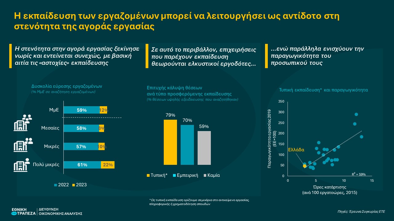 - Ως καταλύτης για την υπέρβαση αυτού του προβλήματος, κυρίως για θέσεις υψηλής εξειδίκευσης, αναδεικνύεται η εκπαίδευση στο χώρο εργασίας. Ειδικότερα, βάσει της έρευνας της ΕΤΕ, επιχειρήσεις που παρέχουν εκπαίδευση στο προσωπικό τους (σχεδόν 1/3 του τομέα) επιτυγχάνουν υψηλότερη κάλυψη θέσεων εργασίας κατά περίπου 20 ποσοστιαίες μονάδες, ενώ παράλληλα απολαμβάνουν οφέλη παραγωγικότητας.
