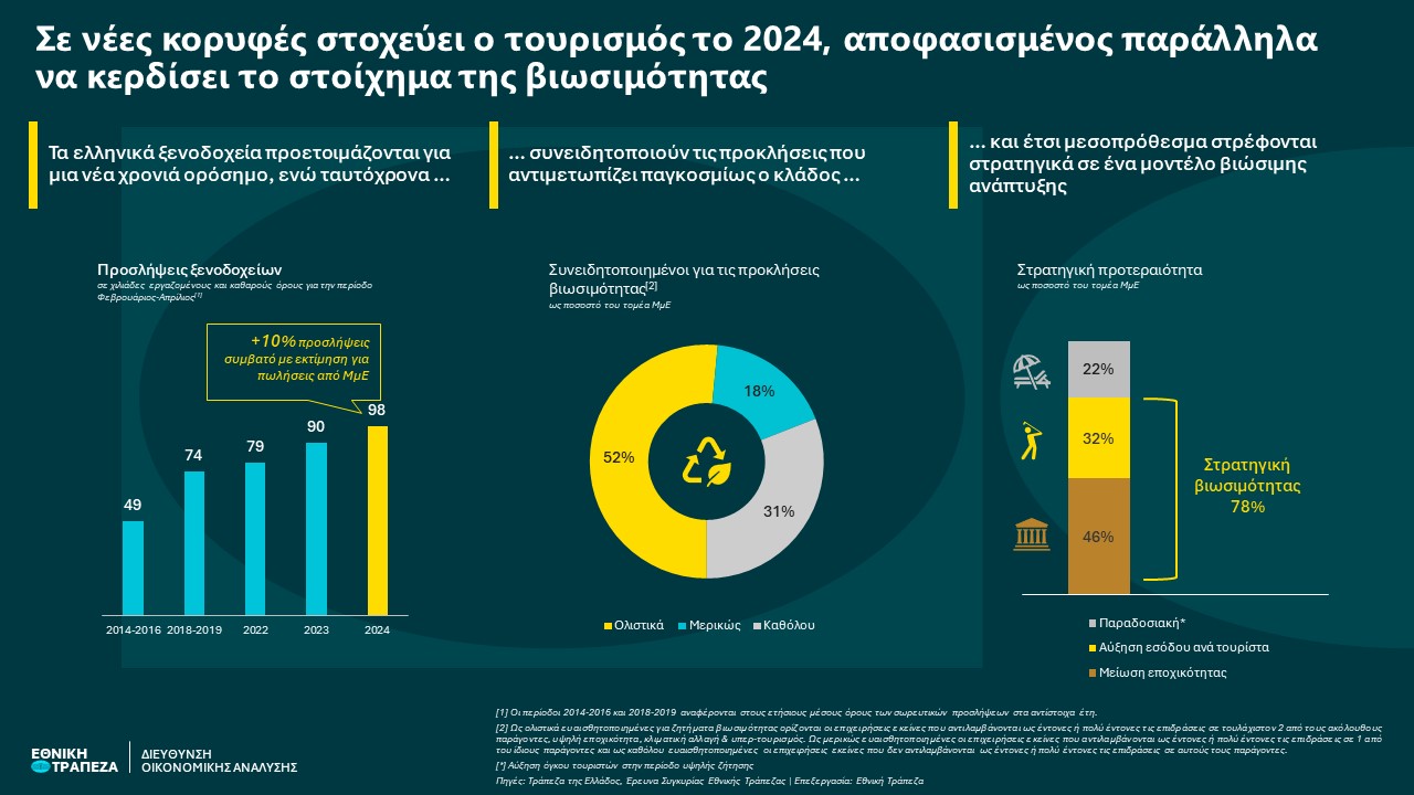 Ο ελληνικός τουρισμός το 2024 μπορεί να επαναλάβει την περσινή επιτυχία, έχοντας ήδη μια δυναμική εκκίνηση χρονιάς (+24% στις αφίξεις του 1ου τριμήνου, έναντι 2023) και θετικούς οιωνούς για τη συνέχεια από σχεδόν το σύνολο των πρόδρομων δεικτών. Συγκεκριμένα, ο δείκτης μελλοντικής ζήτησης των ελληνικών ξενοδοχείων βρίσκεται σε ιστορικά υψηλά επίπεδα, με την αισιοδοξία να αποτυπώνεται σε ρεκόρ καθαρών προσλήψεων για το διάστημα Φεβρουάριος-Απρίλιος (+98 χιλ. έναντι +90 χιλ. το 2023). Παράλληλα, η αεροπορική κίνηση εξωτερικού σε σχέση με τα μεγέθη 2023 καταγράφει: