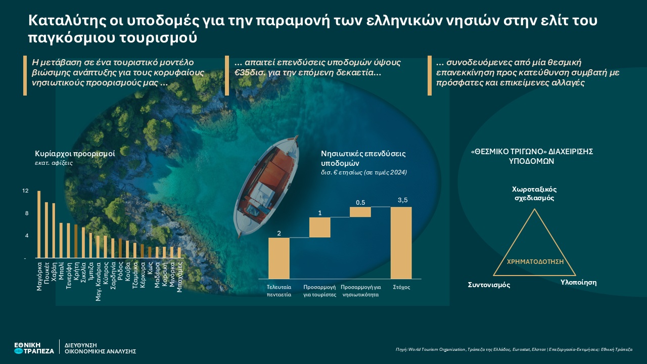 Η Ελλάδα είναι ένας κατεξοχήν νησιωτικός τουριστικός προορισμός, με τα νησιά να φιλοξενούν σχεδόν το ½ των ξένων τουριστών της χώρας και να έχουν διπλασιάσει τις αφίξεις την τελευταία 15ετία, φθάνοντας τα 16 εκατ. το 2024. Ξεχωρίζουν και σε παγκόσμιο επίπεδο (11% του παγκόσμιου νησιωτικού τουρισμού), με επτά ελληνικά νησιά ανάμεσα στους 30 κορυφαίους προορισμούς διεθνώς – δίπλα σε εμβληματικά νησιά όπως το Μπαλί και η Χαβάη. Η διατήρηση αυτής της θέσης εξαρτάται πλέον από την ικανότητά τους να αντέξουν τις αυξανόμενες ροές: με 33 τουρίστες ανά km² ημερησίως στην αιχμή (έναντι 2–3 στην υπόλοιπη Ελλάδα και τη Μεσόγειο), οι υποδομές λειτουργούν ήδη στα όριά τους.