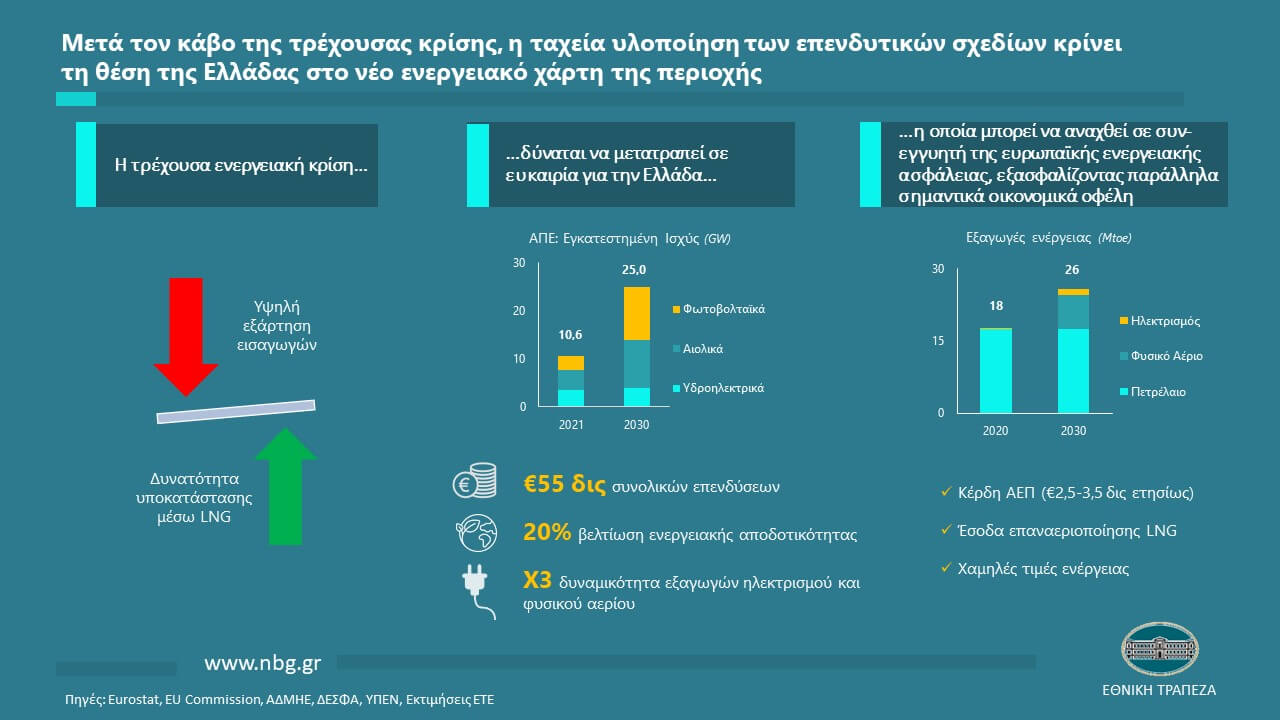 Καθώς η πράσινη μετάβαση δεν αποτελεί πλέον απλά χρέος προς τις επόμενες γενιές αλλά και επένδυση στην ενεργειακή ασφάλεια και ευημερία, είναι η ευκαιρία της Ελλάδας να κινηθεί γρήγορα στη θέσπιση των σχετικών ρυθμιστικών πλαισίων (όπως χάρτες υπεράκτιων αιολικών πάρκων, κανόνες χρήσης γης και ζητήματα αποθήκευσης φυσικού αερίου) ώστε να εξασφαλιστεί η συντονισμένη και ταχεία (έναντι ανταγωνιστικών σχεδίων άλλων χωρών) υλοποίηση των αναγκαίων επενδύσεων για να αναχθεί η χώρα σε περιφερειακό ενεργειακό κέντρο.