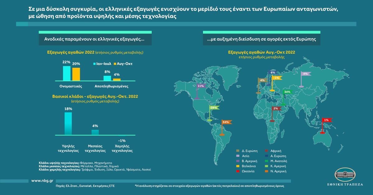 Σημαντική άνοδο της τάξης του 7% σημείωσαν οι ελληνικές εξαγωγές αγαθών σε πραγματικούς όρους (22% σε ονομαστικούς) κατά το πρώτο δεκάμηνο του 2022 – ποσοστό σχεδόν διπλάσιο από το μέσο όρο της προηγούμενης δεκαετίας – ενισχύοντας το μερίδιό τους έναντι του ευρωπαϊκού ανταγωνισμού. Ωστόσο, μια σταδιακή κόπωση διαπιστώνεται κατά τη διάρκεια της χρονιάς, με το ρυθμό ανάπτυξης των εξαγωγών να επιβραδύνει στο 4,6% στο τρίμηνο Αύγουστος-Οκτώβριος 2022 (από 7,5% κατά το πρώτο επτάμηνο του έτους).