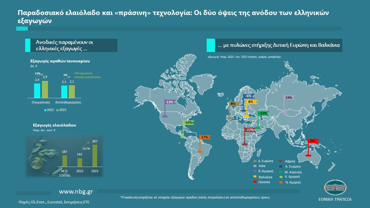 Συνεκτιμώντας τις συγκρατημένες προσδοκίες εξαγωγικών παραγγελιών και τη συνεχιζόμενη (αν και χαμηλότερης έντασης) αβεβαιότητα σε βασικές αγορές της Ευρώπης, εκτιμούμε ότι το 2023 οι ελληνικές εξαγωγές θα συνεχίσουν να κινούνται σε ήπια ανοδικούς ρυθμούς. Βάσει πρόδρομων δεικτών, εκτιμούμε ότι ως βασική κινητήριος δύναμη θα παραμείνουν οι εξαγωγές υψηλής τεχνολογίας, οι οποίες κινούνται με υψηλότερους ρυθμούς σταθερά κατά την τελευταία 6ετια σε σχέση με τις λοιπές ελληνικές εξαγωγές (με την απόκλιση να είναι της τάξης των 6-7 ποσοστιαίων μονάδων). Η εξέλιξη αυτή, σε συνδυασμό με την ενίσχυση επενδύσεων R&D, αυξάνει την πιθανότητα σύγκλισης στο θετικό μας σενάριο για μεσοπρόθεσμη ανάπτυξη εξαγωγών της τάξης του 8% ετησίως (έναντι 5% στο βασικό μας σενάριο). Παράλληλα, η ενισχυμένη παρουσία του cluster προϊόντων υψηλής τεχνολογίας μπορεί να ευνοήσει ευρύτερα την ανάπτυξη και εξωστρέφεια της ελληνικής οικονομίας.
