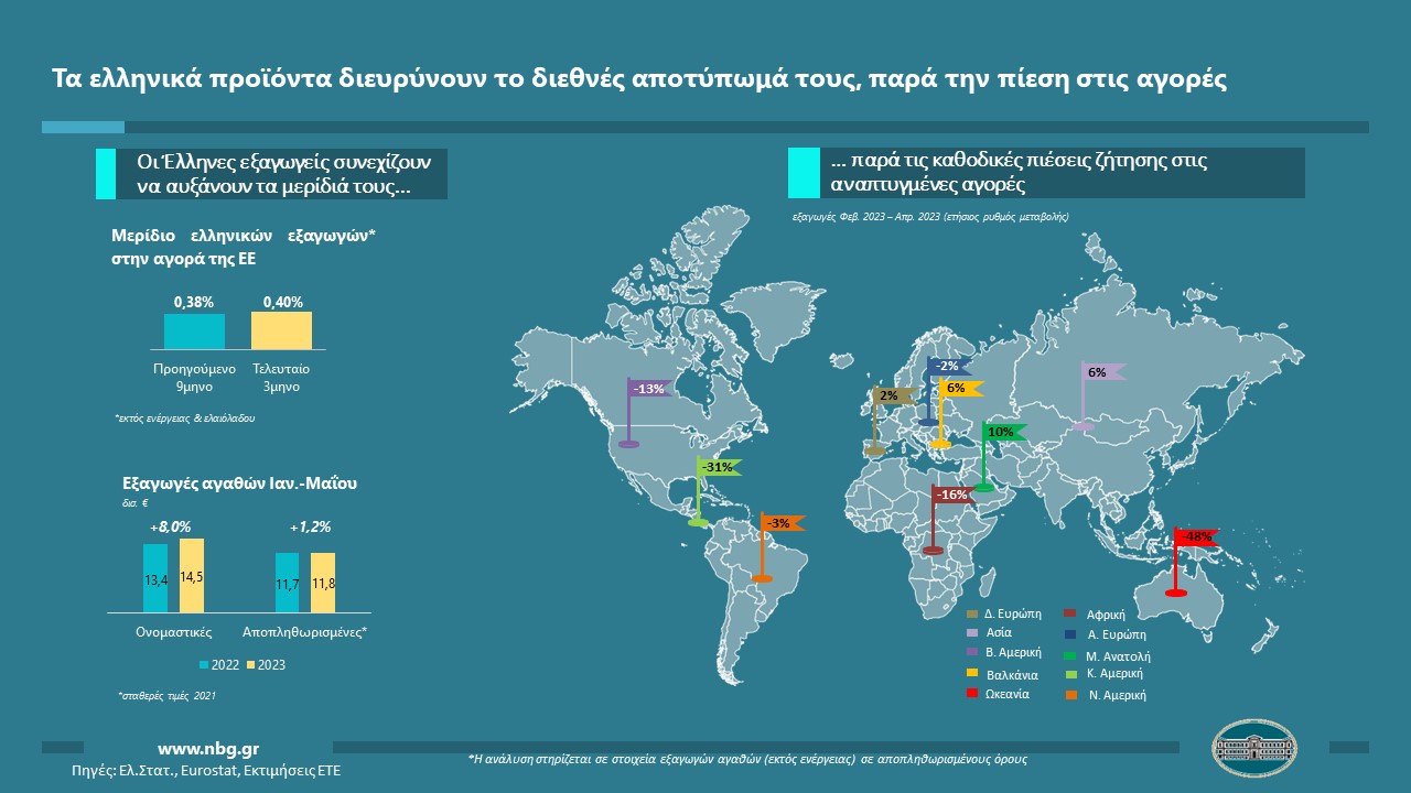 Σε ένα περιβάλλον αδύναμης διεθνούς ζήτησης, οι ελληνικές εξαγωγές αγαθών το τρίμηνο Φεβρουαρίου-Απριλίου 2023, αν και έριξαν ταχύτητα (+0,4% σε αποπληθωρισμένους όρους) μετά από μια διετία αλματώδους ανάπτυξης (με μέσο ετήσιο ρυθμό της τάξης του 10%), κατάφεραν να αυξήσουν το μερίδιό τους στις αγορές εξωτερικού.