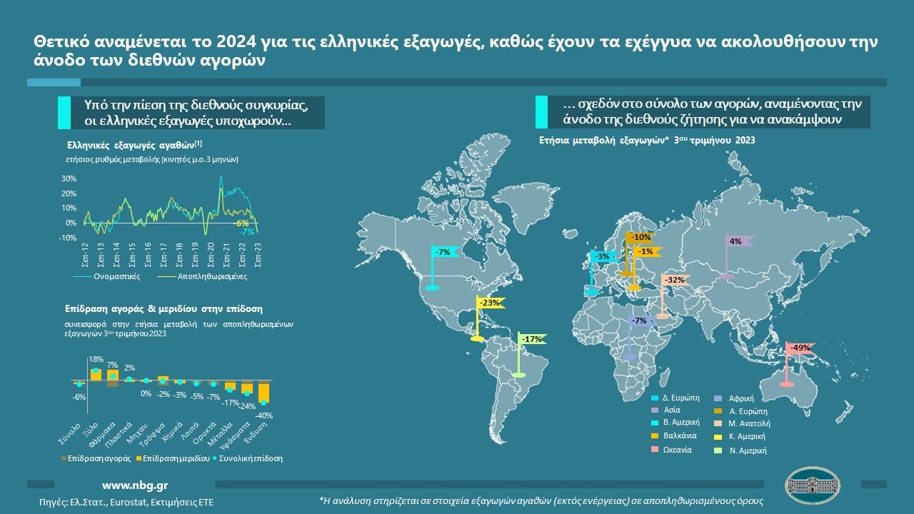 Υπό αυτά τα δεδομένα, οι ελληνικές εξαγωγές, επιταχύνοντας συνεχώς μέσα στη χρονιά, εκτιμάται ότι θα αυξηθούν κατά 2-3% το 2024 (σε αποπληθωρισμένους όρους) – παραμένοντας ωστόσο χαμηλότερα της μεσοπρόθεσμης τάσης για την ετήσια ανάπτυξή τους (της τάξης του 5%).