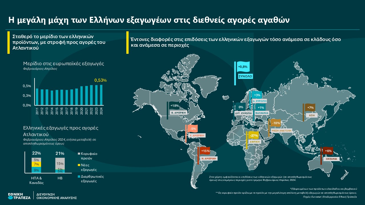 Παράλληλα, το 2024 εξακολουθεί να είναι ένα έτος έντονων προκλήσεων, καθώς η διαρκής γεωπολιτική αναταραχή και οι πολιτικές εξελίξεις σε ΕΕ και ΗΠΑ μπορούν να επηρεάσουν απρόσμενα αλλά καθοριστικά τις ελληνικές εξαγωγές. Παράλληλα, η κλιματική αλλαγή παραμένει διαρκής απειλή για την αγροτική παραγωγή, η οποία κατέχει κομβικό ρόλο στις ελληνικές εξαγωγές, με τα τρόφιμα να καλύπτουν το ¼ των εξαγωγών.