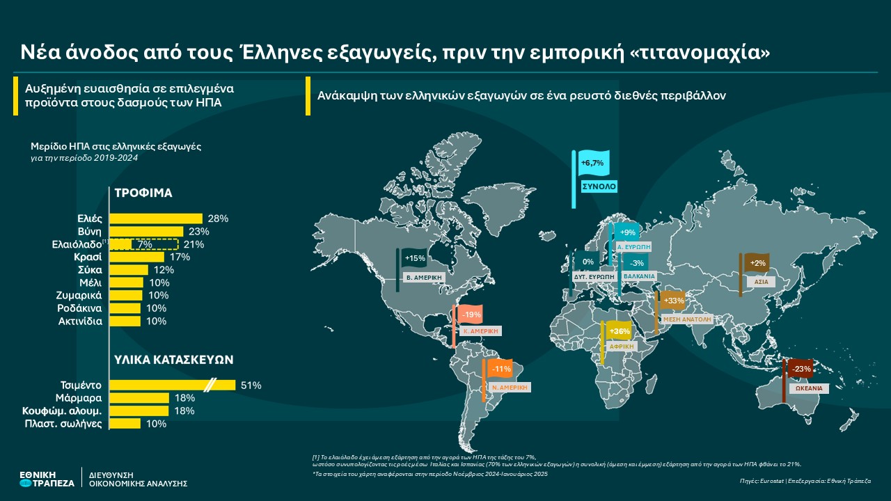 Η αγορά των ΗΠΑ έχει αναδειχθεί σε μια δυναμική αγορά για τα ελληνικά προϊόντα την τελευταία 6ετία (2019-2024), απορροφώντας το 5,3% των ελληνικών εξαγωγών το 2024 (από 4,5% το 2019) και συνεισφέροντας το 7% της ανόδου 6ετίας. Παρά την άνω δυναμική, το συνολικό μερίδιο των ΗΠΑ στις ελληνικές εξαγωγές παραμένει σχετικά χαμηλό συγκριτικά με το ευρωπαϊκό (καθώς οι ΗΠΑ απορροφούν 20% των ευρωπαϊκών εξαγωγών) – με αποτέλεσμα το ενδιαφέρον των αναλυτών να στρέφεται κυρίως στις υψηλότερες έμμεσες επιδράσεις των δασμών, μέσω του οικονομικού πλήγματος σε βασικούς μας εταίρους.