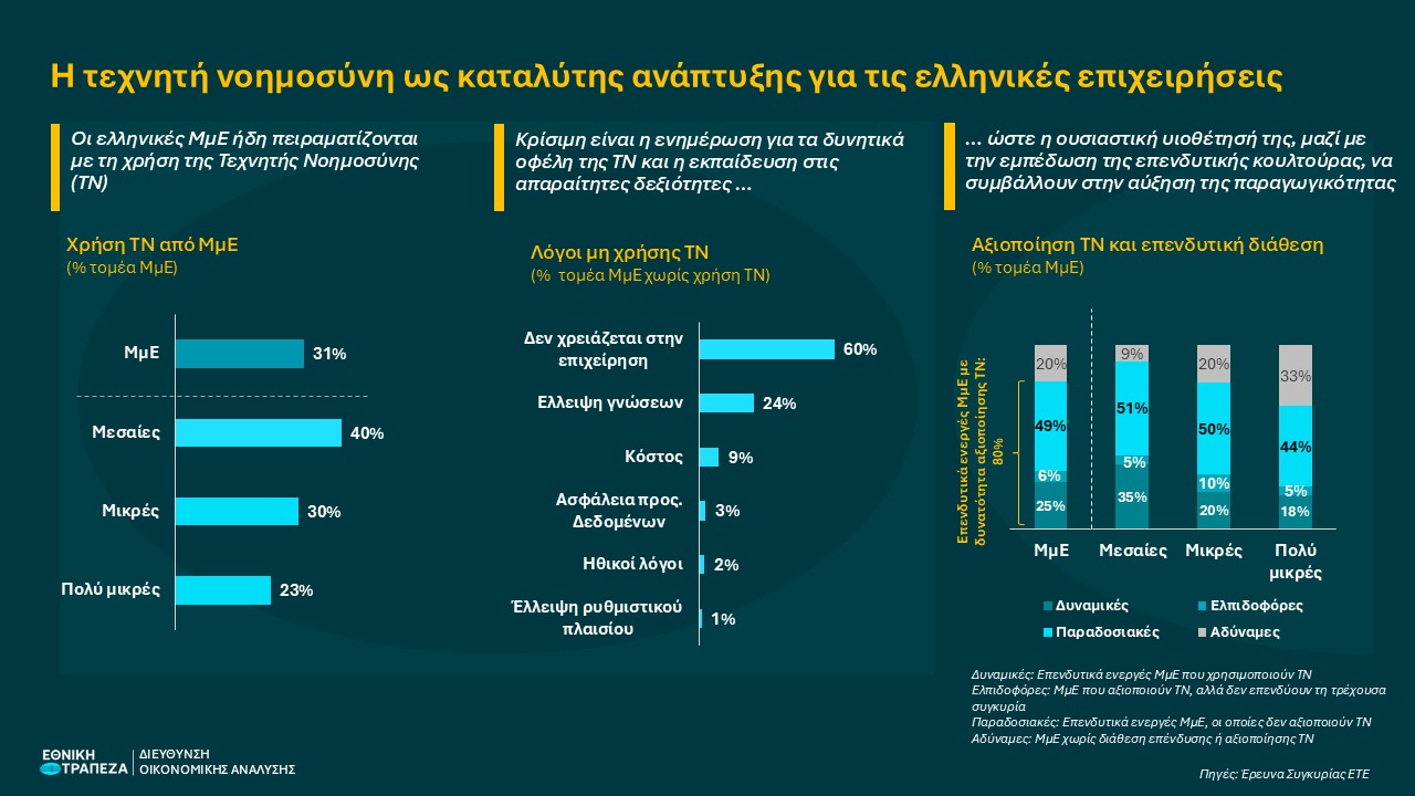 Η τεχνητή νοημοσύνη (ΤΝ), που διεθνώς αναγνωρίζεται ως ο επόμενος μεγάλος επιταχυντής παραγωγικότητας, αρχίζει να κερδίζει έδαφος στον ελληνικό επιχειρηματικό χάρτη. Σύμφωνα με την τελευταία έρευνα της Εθνικής Τράπεζας για τις μικρομεσαίες επιχειρήσεις, ήδη 1 στις 3 ΜμΕ έχει έρθει σε επαφή με εργαλεία ΤΝ — μια εξέλιξη που δείχνει ότι η τεχνολογία αυτή παύει πλέον να αποτελεί υπόθεση των «λίγων και μεγάλων». Την ίδια στιγμή, όμως, παραμένει μεγάλο το ανεκμετάλλευτο δυναμικό, καθώς περίπου 1 στις 2 επιχειρήσεις, παρότι επενδυτικά ενεργή, δεν έχει ακόμη επιχειρήσει να αξιοποιήσει την ΤΝ. Η πρόκληση για τις επιχειρήσεις είναι διπλή: πρώτον, να πειστούν ότι η ΤΝ τις αφορά, και δεύτερον, να αποκτήσουν τις δεξιότητες που απαιτεί η πρακτική εφαρμογή της. Η ενεργοποίηση αυτού του κρίσιμου — ακόμη τεχνολογικά αδρανούς — τμήματος του επιχειρείν αποτελεί κομβικό στοίχημα για την ελληνική οικονομία, καθώς η ευρύτερη διάχυση της ΤΝ, σε συνδυασμό με την ενίσχυση των επενδύσεων, μπορεί να λειτουργήσει ως διπλός καταλύτης για το κλείσιμο του παραγωγικού κενού με την υπόλοιπη Ευρώπη.