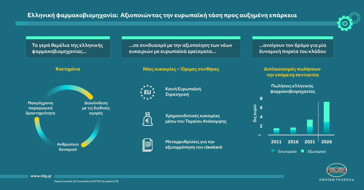 Συνοψίζοντας, βάσει των εκτιμήσεων της ΕΤΕ, η ελληνική φαρμακοβιομηχανία διαθέτει τη δύναμη πυρός να διπλασιάσει τις πωλήσεις της την επόμενη πενταετία (από €3,4 δις το 2021 σε €7,2 δις το 2026), με βασικούς οδηγούς τόσο την αυξημένη εξωστρέφεια, όσο και την άνοδο της διείσδυσης των γενοσήμων στην ελληνική αγορά. Υπό αυτή την προοπτική και αξιοποιώντας το υψηλής ποιότητας εξειδικευμένο δυναμικό της (3πλάσιου σχετικού μεγέθους σε σχέση με τον ΕΕ μέσο όρο), η Ελλάδα μπορεί παράλληλα να αυξήσει τις ερευνητικές της δαπάνες και να αναχθεί σε ολοκληρωμένο hub παραγωγής και καινοτομίας φαρμάκων.