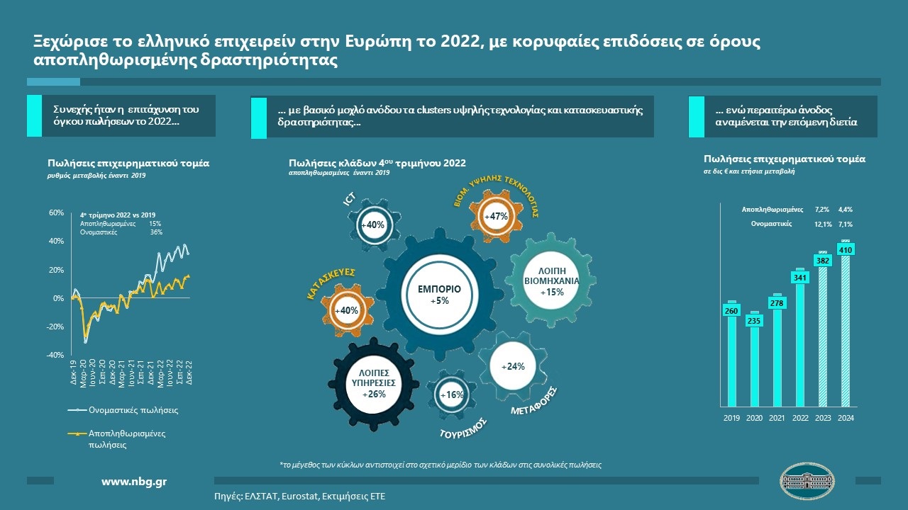 Με το δεξί ξεκίνησε το 2023, με τις αποπληθωρισμένες πωλήσεις να σημειώνουν ετήσια άνοδο 15% κατά τον πρώτο μήνα της χρονιάς, επιβεβαιώνοντας ότι ο επιχειρηματικός τομέας παραμένει ανθεκτικός παρά τις συνθήκες αβεβαιότητας. Ανοδική εκτιμάται να παραμείνει η πορεία τους επόμενους μήνες, παράγοντας ρυθμό ανόδου της τάξης του 7% για το 2023 και 4-5% για το 2024. Οι υψηλές επενδύσεις (ιδιωτικές και δημόσιες), οι οποίες θα είναι η κινητήρια δύναμη της ελληνικής οικονομίας το 2023, εκτιμάται ότι θα τροφοδοτήσουν τα 3 clusters που ξεχώρισαν το 2022. Έτσι, η κλαδική δομή του ελληνικού επιχειρείν θα συνεχίσει την πορεία σταδιακής σύγκλισης με την ΕΕ, στηρίζοντας εμμέσως τους εξωστρεφείς τομείς αγαθών και υπηρεσιών.
