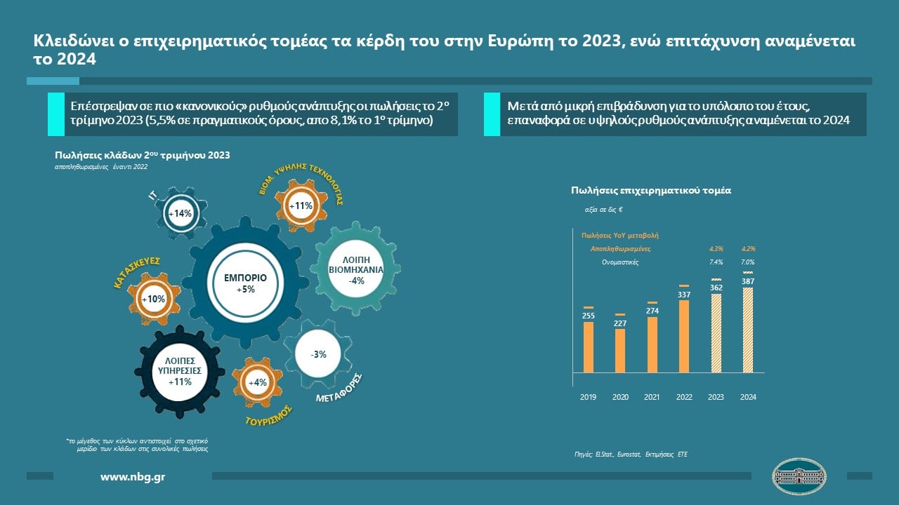 Συνεκτιμώντας τα παραπάνω, το ελληνικό επιχειρείν εκτιμάται να διατηρήσει ρυθμούς αύξησης πωλήσεων σε σχετικά χαμηλά - ωστόσο υγιή - επίπεδα κατά το 2ο εξάμηνο του 2023 (2% με 3% σε αποπληθωρισμένους όρους). Κοιτάζοντας ακόμα πιο μπροστά, οι μηχανές ανάπτυξης το 2024 αναμένεται να παραμείνουν σε υψηλές ταχύτητες, κυρίως για κατασκευές και κλάδους τεχνολογίας (με καύσιμο τους πόρους του Ταμείου Ανάκαμψης), ενώ η σταδιακή ομαλοποίηση των πληθωριστικών πιέσεων αναμένεται να επαναφέρει τον λοιπό τομέα στη μεσοπρόθεσμη τάση του. Υπό αυτές τις συνθήκες οι πωλήσεις το 2024 εκτιμάται ότι θα πετύχουν ρυθμό ανόδου άνω του 4% σε αποπληθωρισμένους όρους.