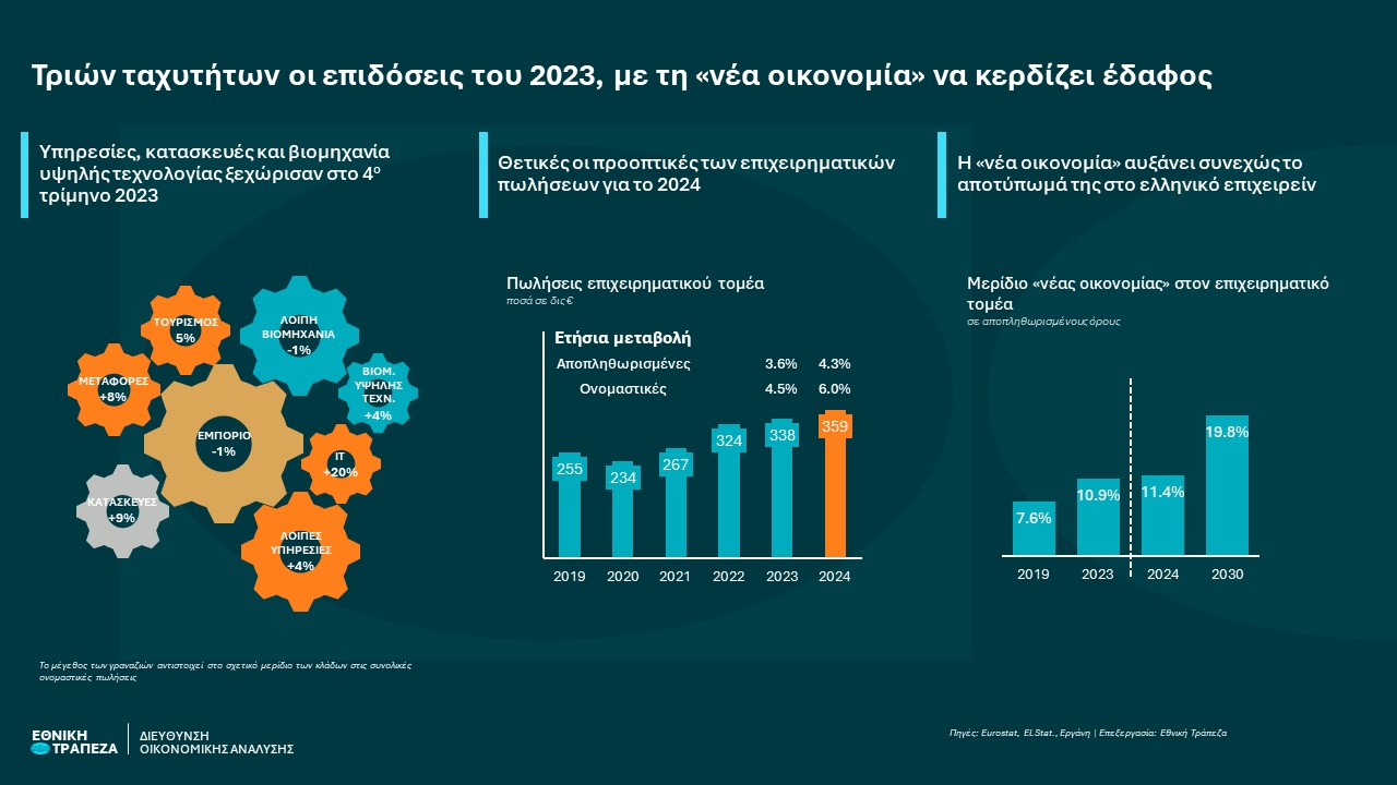 Κοιτάζοντας σε πιο μεσοπρόθεσμο ορίζοντα και πέρα από τους συγκυριακούς κλυδωνισμούς, το στοιχείο που ξεχωρίζει στο ελληνικό επιχειρείν και εκτιμάται ότι θα αφήσει το βαθύτερο αποτύπωμα τα επόμενα χρόνια είναι η συνεχής άνοδος των κλάδων της «νέας οικονομίας», καλύπτοντας τομείς από το ΙΤ μέχρι τη βιομηχανία υψηλής τεχνολογίας και το R&D. Ήδη, το μερίδιο αυτής στις πωλήσεις του επιχειρηματικού τομέα έχει ανέλθει στο 10,9% το 2023 από 7,6% το 2019. Σημειώνουμε ενδεικτικά ότι το 2023 πέτυχε τριπλάσιο ρυθμό ανάπτυξης από το λοιπό επιχειρηματικό τομέα (11,2% έναντι 2,8%). Συνεχίζοντας στην τάση ανάπτυξης των τελευταίων ετών, το μερίδιο της «νέας οικονομίας» έχει τα εχέγγυα να φτάσει το 20% μέχρι το 2030. Με τις έμμεσες θετικές επιδράσεις να διαχέονται στο σύνολο των κλάδων, η διαμόρφωση αυτού του νέου πρότυπου επιχειρηματικής οικονομίας στην Ελλάδα αποτελεί το υπέρτατο στοίχημα.