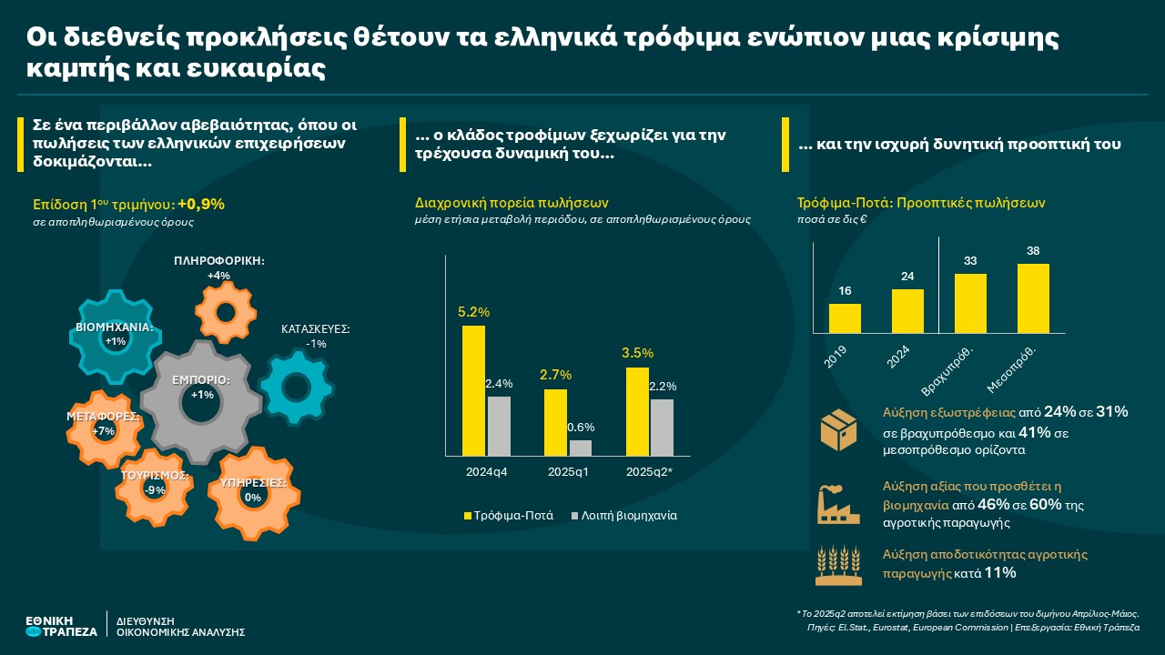 Η μετάβαση σε αυτό το νέο παραγωγικό μοντέλο προϋποθέτει συντονισμένες διαρθρωτικές παρεμβάσεις. Βάσει υποδείγματος της ΕΤΕ, οι κύριες παράμετροι που συνδέονται με τη μετάβαση σε ένα αγροδιατροφικό τομέα υψηλής προστιθέμενης αξίας είναι i) η ενίσχυση της έρευνας και ανάπτυξης (γεωργία ακριβείας, τεχνολογία μεταποίησης, τυποποίηση) και ii) η δημιουργία σχημάτων συνεργασίας (clusters, συνεταιρισμοί) για επίτευξη οικονομιών κλίμακας. Σε μια εποχή εμπορικής έντασης, διεθνούς μεταβλητότητας και αναδιάταξης των ευρωπαϊκών χρηματοδοτικών προτεραιοτήτων, ο κλάδος τροφίμων και ποτών έχει την ευκαιρία — και όχι απλώς τη δυνατότητα — να μετεξελιχθεί σε διαρθρωτικό μοχλό ανάπτυξης για την ελληνική οικονομία.