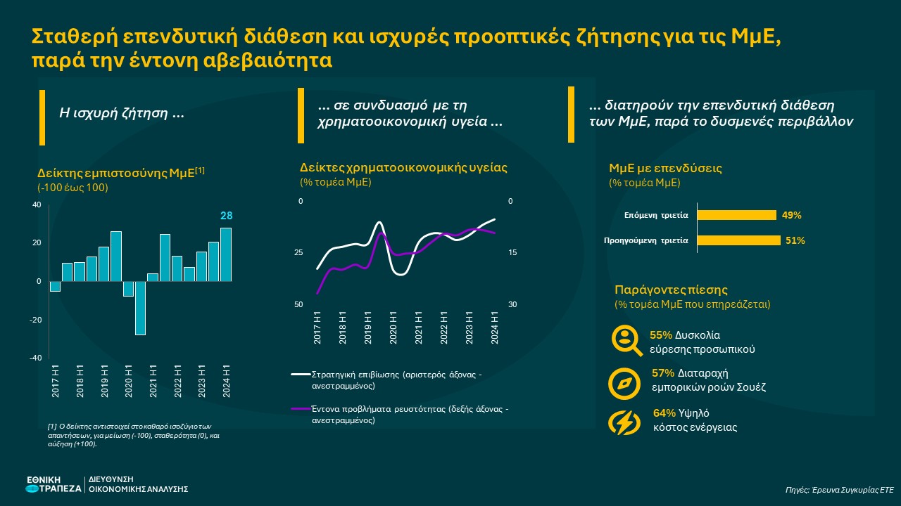 Με τις γεωπολιτικές και κλιματικές πιέσεις να συνεχίζουν να δημιουργούν ομίχλη αβεβαιότητας στην περιοχή μας, ερωτηματικό αποτελεί πόσο αντέχουν και πώς αντιδρούν οι ΜμΕ σε αυτό το περιβάλλον διαρκών πιέσεων. Υπό αυτή την οπτική, η Διεύθυνση Οικονομικής Ανάλυσης της ΕΤΕ, αξιοποιώντας την τακτική έρευνα πεδίου της, αναδεικνύει την ισχυρή ζήτηση αλλά και την ανθεκτικότητα επενδυτικής διάθεσης που χαρακτηρίζει τις ΜμΕ. Παράλληλα, η συνεχώς βελτιούμενη χρηματοοικονομική υγεία αποτελεί ισχυρό εργαλείο για περαιτέρω υλοποίηση αναπτυξιακής δυναμικής, όταν το επιτρέψει η εξομάλυνση των εξωτερικών συνθηκών.