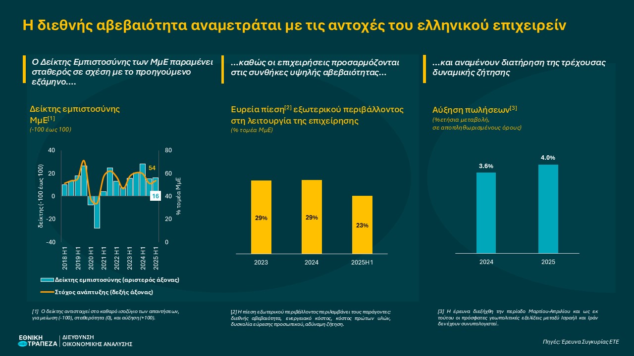 Υπό αυτές τις συνθήκες, το επιχειρηματικό κλίμα παρέμεινε σχετικά σταθερό το πρώτο εξάμηνο του 2025, παρά την έντονη αβεβαιότητα, καθώς ο σχετικός Δείκτη Εμπιστοσύνης που παρακολουθεί η ΕΤΕ κινείται στα επίπεδα του προηγούμενου εξαμήνου (16 μονάδες), όντας σημαντικά υψηλότερα από το μέσο όρο της προηγούμενης δεκαετίας (7 μονάδες). Παράλληλα, η πλειοψηφία του τομέα διατηρεί ενεργά σχέδια ανάπτυξης, σημειώνοντας μικρή άνοδο έναντι του προηγούμενου εξαμήνου (από 51% σε 54% των ΜμΕ).