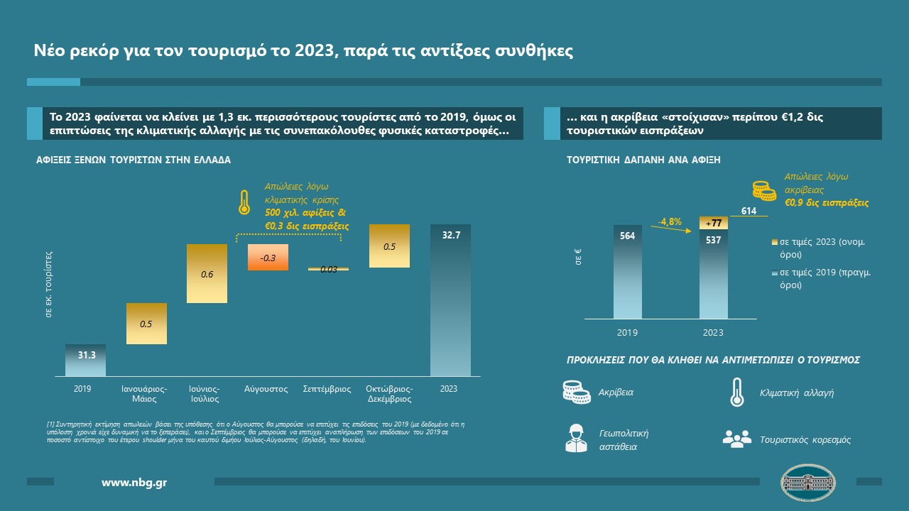 Έτσι, στο σύνολο του 2023, ο ελληνικός τουρισμός αναμένεται να καταγράψει ρεκόρ αφίξεων (της τάξης του +4% έναντι 2019), και εισπράξεις άνω των €20 δις – επίπεδο συμβατό με την προηγούμενη εκτίμησή μας (τεύχος τρίτου τριμήνου) – καταλήγοντας έτσι 13% υψηλότερα σε σχέση με το 2019. Αξιοσημείωτο είναι ότι η εξαιρετική αυτή επίδοση επιτυγχάνεται σε μια χρονιά με αντίξοες συνθήκες, οι οποίες στοίχισαν στον ελληνικό τουρισμό εισπράξεις της τάξης του €1,2 δις: