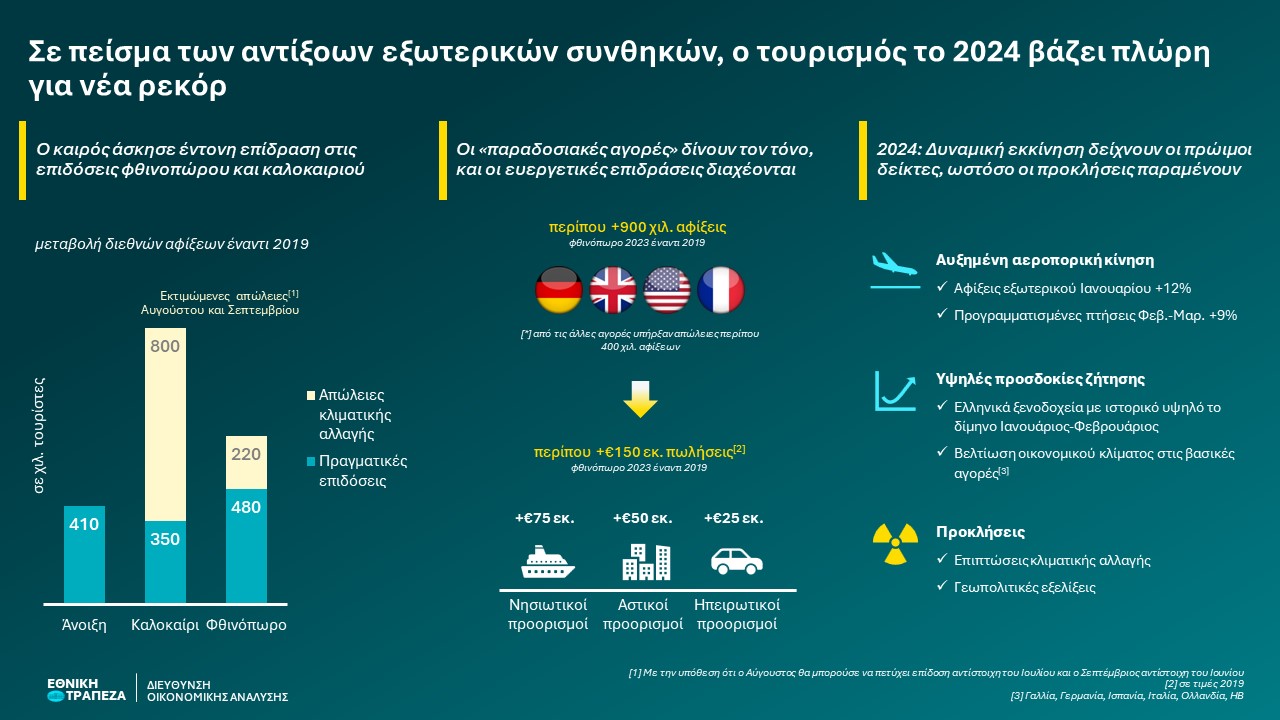 Εν μέσω συγκυρίας αδύναμης ευρωπαϊκής ανάπτυξης (κυρίως στη Γερμανία) και γεωπολιτικών πιέσεων, ο ελληνικός τουρισμός φαίνεται να βγάζει άμυνες ανακτώντας την αυτόνομη δυναμική του. Έτσι, σε μια χρονιά με εκτιμώμενη ισχυρή άνοδο του διεθνούς τουρισμού, η Ελλάδα δείχνει ότι μπορεί να διεκδικήσει νέα ρεκόρ. Ωστόσο, απαιτείται εγρήγορση, καθώς γεωπολιτικές και κλιματικές πιέσεις παραμένουν σε ισχύ, και μπορεί να επηρεάσουν απροσδόκητα και καταλυτικά την πορεία του κλάδου.