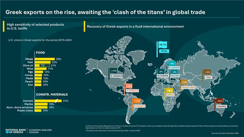 However, through a more detailed approach, the National Bank of Greece identifies 23 specific products that are potentially vulnerable to the direct effects of tariffs, as they have maintained over the past six years in the U.S.: (i) a consistent export presence, (ii) cumulative exports exceeding €10 million, and (iii) high dependence (over 10% of their total exports). These products mainly belong to the food, construction materials, and electrical equipment sectors. Specifically: