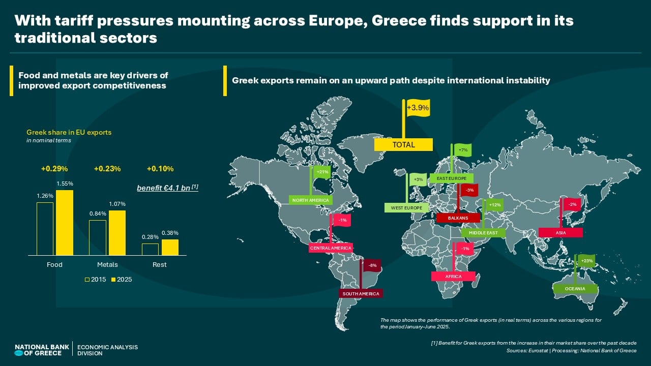 A prominent feature of the current environment is the resilience of Greek exports during a period of geopolitical tensions and a stronger euro. Greece recorded the 5th highest export performance in Europe during the 1st half of 2025, achieving a top 10 performance in 5 out of 10 broad sectors. As a result, the market share of Greek products against their European competitors increased to 0.6% (from 0.4% in 2015) – a significant increase in market share during the last decade, which adds €4.1 billion to the country's exports this year.