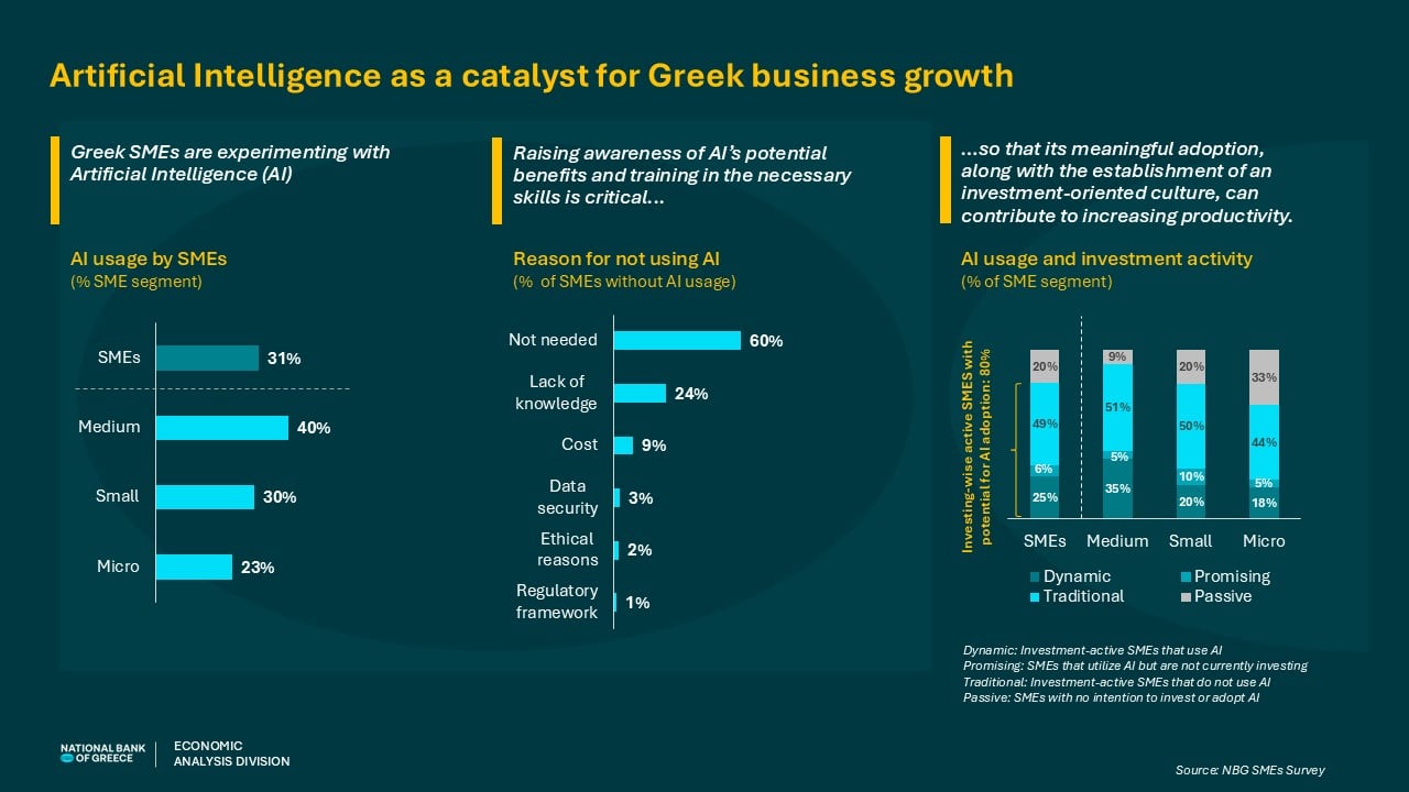 Artificial Intelligence (AI), widely recognized internationally as the next major driver of productivity, is beginning to gain ground on the Greek business landscape. According to the latest survey by the National Bank of Greece on small and medium-sized enterprises (SMEs), already 1 in 3 SMEs has engaged with AI tools — a development that signals this technology is no longer the domain of “the few and the large”. At the same time, however, significant potential remains untapped, as about 1 in 2 enterprises, despite actively engaging in investments, has yet to attempt utilizing AI. The challenge for businesses is twofold: first, to be convinced that AI is relevant to them, and second, to acquire the skills necessary for its practical implementation. Activating this critical — yet technologically dormant — segment of entrepreneurship is a pivotal challenge for the Greek economy, as the broader diffusion of AI, combined with increased investment intensity, can serve as a dual catalyst in closing the productivity gap with the rest of Europe.