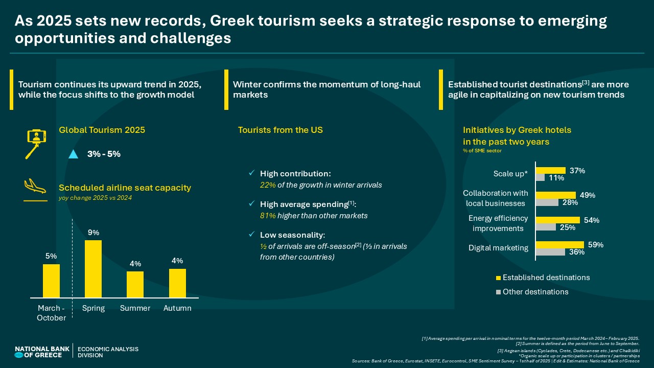 Regarding source markets, long-haul tourism is expected to play a key role in the sector’s medium-term momentum, contributing ½ of the increase in global tourism over the next decade (as highlighted in a previous study). In this context, attracting long-haul travellers will allow Greece to transition to a new tourism model characterized by lower seasonality and higher average spending. Early signs of this shift are evident in winter season performance, with the US gaining market share (7% of arrivals in 2025, up from 6% in 2024) and simultaneously outperforming in terms of spending per arrival (double that of other markets) and seasonality (½ of arrivals outside the summer period, versus ⅓ for other markets). This trend is further supported by the expansion of direct air connections with the U.S. market (reaching almost 100 flights/week in summer 2025, almost double than those in pre-pandemic period) and China (reaching almost 12 flights/week in summer 2025, almost triple than those in pre-pandemic period).